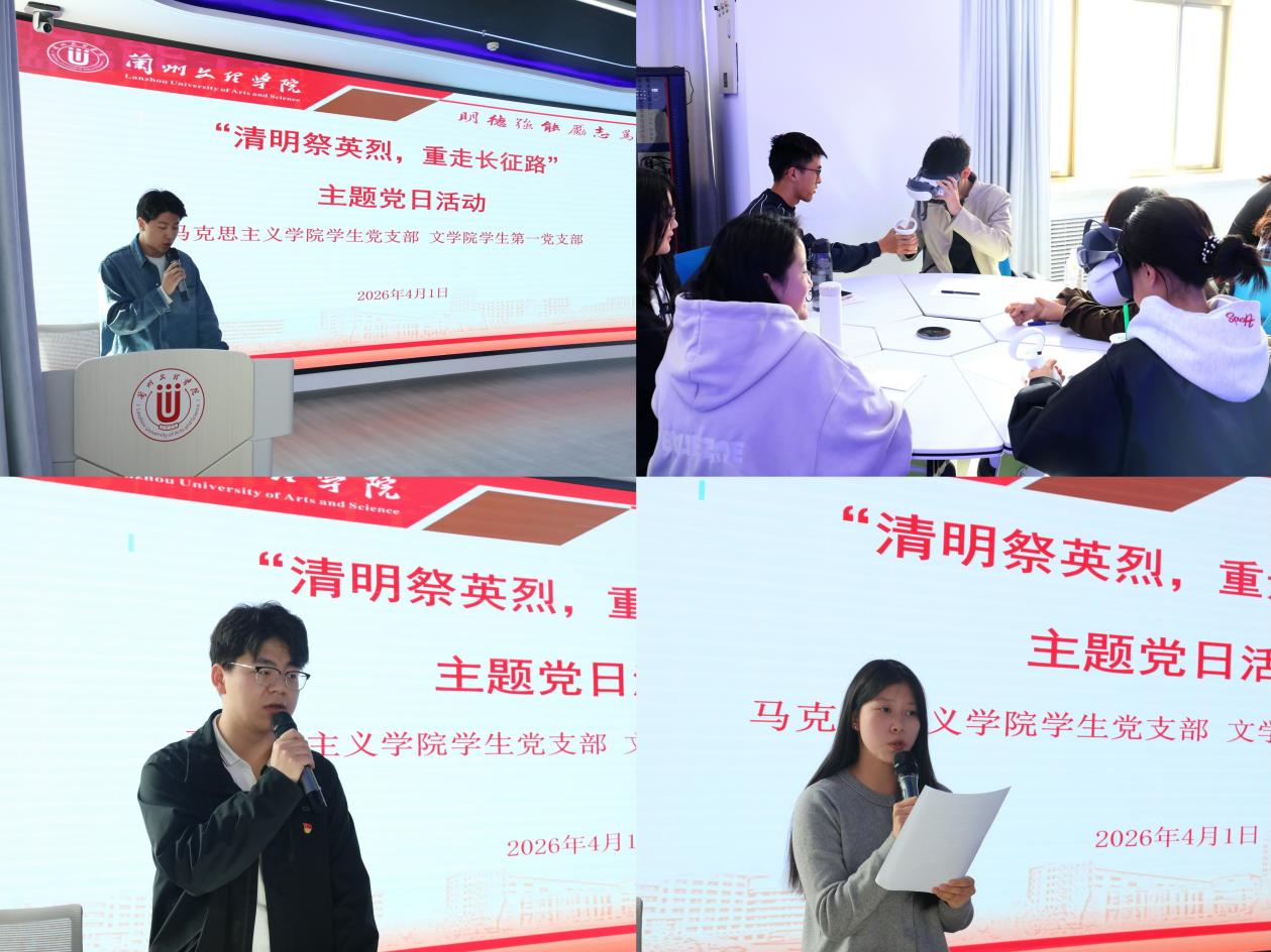 为弘扬长征精神,培养青年学生家国情怀,4月1日,文学院学生第一党支部与马克思主义学院学生党支部在马克思主义学院VR教室开展“清明祭英烈,重走长征路”主题党日活动,两个党支部党员、入党积极分子参加活动。